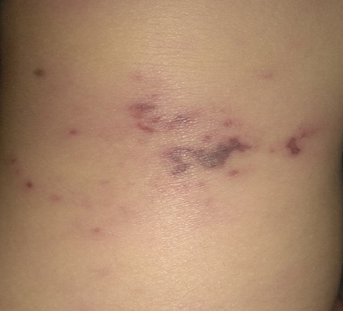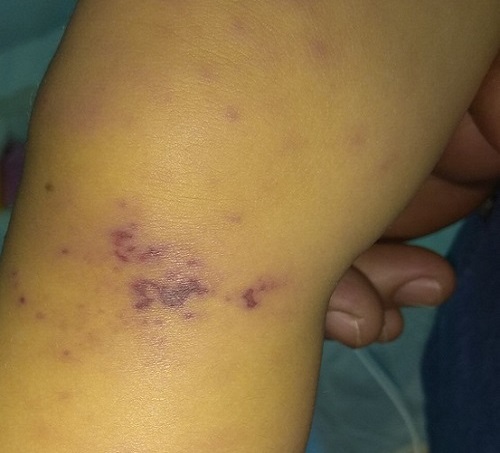Το παιδί παρουσίασε υψηλό πυρετό (39.ºC) με ρίγος και έμετο χωρίς σπασμούς που υφέθηκε με από του στόματος αντιπυρετικό (παρακεταμόλη). Οι γονείς θορυβήθηκαν με την έκθυση του εξανθήματος και ευτυχώς μετέφεραν το παιδί στο νοσοκομείο. Αν και το αρχικό εξάνθημα ήταν σχετικά άτυπο τις επόμενες ώρες εμφανίστηκε το χαρακτηριστικό εξάνθημα που στον δικό μας μικρό ασθενή αφορούσε στα κάτω άκρα.