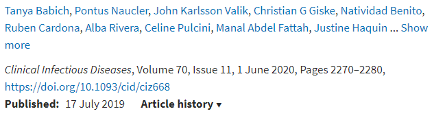134 (17.5%) από τους 767 ασθενείς πέθαναν εντός 30 ημερών. Το είδος του αντιμικροβιακού δεν ήταν σημαντικός παράγοντας κινδύνου για θάνατο στις 30 ημέρες όπως προέκυψε από την ανάλυση μιας μεταβλητής. Η θνητότητα 30 ημερών από οποιαδήποτε αιτία ήταν 37/213 (17.4%) για την κεφταζιδίμη, 42/210 (20%) για τις καρβαπενέμες και 55/344 (16%) για την πιπερακιλλίνη – ταζομπακτάμη (p 0.483). Σημαντικοί παράγοντες θνητότητας στην ανάλυση μιας μεταβλητής ήταν: χρόνια κατάκλιση, παρουσία ρινογαστρικού σωλήνα, διασωλήνωση/τραχειοστομία κατά την καταγραφή του περιστατικού, νοσηλεία τις τελευταίες 90 ημέρες, παρούσα νοσηλεία σε ΜΕΘ, υψηλός δείκτης συννοσηροτήτων (Charlson index), μεταστατική νόσος, ενδονοσοκομειακή λοίμωξη, υψηλό SOFA score, χαμηλά επίπεδα αλβουμίνης, ταχυκαρδία και χαμηλή συστολική πίεση κατά την εμφάνιση της λοίμωξης. Η παρουσία ουρολοίμωξης ως αίτιο της βακτηριαιμίας ήταν προστατευτική ενώ η παρουσία πνευμονίας αύξανε τον κίνδυνο θανάτου. Η χρήση μέγιστης επιτρεπόμενης δόσης του αντιμικροβιακού δεν φάνηκε να μειώνει τη θνητότητα. Ανάλυση που να περιλαμβάνει μέγιστες δόσεις αντιμικροβιακού σε ασθενείς με χειρότερο SOFA score απέτυχε επίσης να αποδείξει μείωση της θνητότητας.
