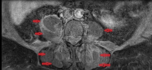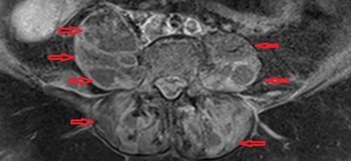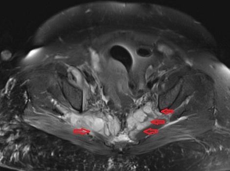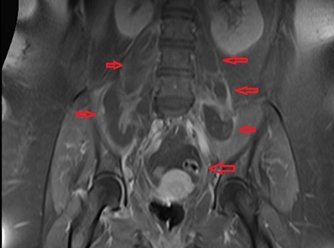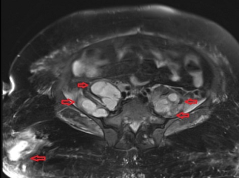 Στις εικόνες της μαγνητικής διακρίνονται τα διάφορα αποστήματα (κόκκινα βέλη) στους μύες (λαγνοψωίτες, απιοειδείς και δεξιό γλουτιαίο).