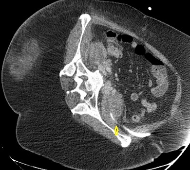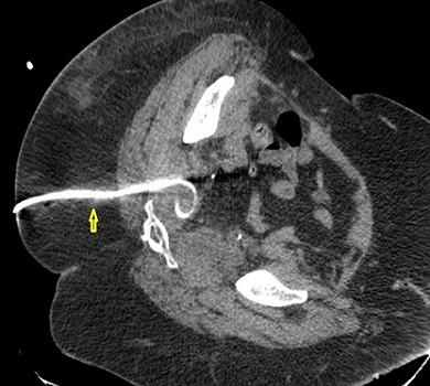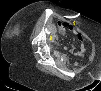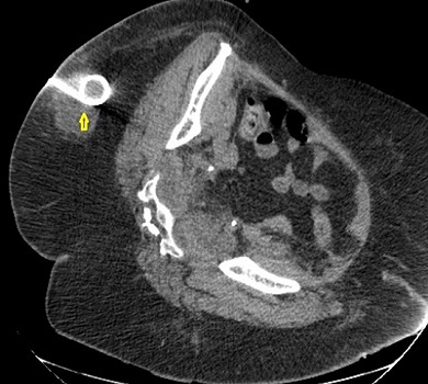 Παρακάτω φαίνονται οι παροχετεύσεις (κίτρινα βέλη) που καταλήγουν εντός των αποστηματικών κοιλοτήτων σε διάφορες τομές της αξονικής τομογραφίας.