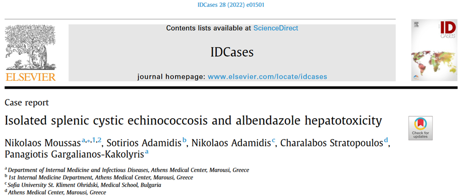 Η μεμονωμένη εντόπιση εχινοκόκκου κύστης στο σπλήνα είναι πολύ σπάνια. Σε αυτό το άρθρο παρουσιάζουμε ένα περιστατικό Έλληνα με το νόσημα αυτό, ο οποίος παρουσίασε ηπατοτοξικότητα μετά την χορήγηση αλβενδαζόλης. Γενικά η αλβενδαζόλη είναι πολύ καλά ανεκτή, ασφαλής και έχει δοθεί σε εκατομμύρια ασθενείς σε όλο τον κόσμο στα πλαίσια καταπολέμησης διαφόρων παρασιτικών νοσημάτων. Η χορήγηση μεβενδαζόλης αποδείχτηκε καλά ανεκτή και χωρίς τοξικότητες. Ένα ενδιαφέρον περιστατικό που είχαμε την ευκαιρία να διαχειριστούμε σε συνεργασία με την Α Παθολογική του Ιατρικού Αθηνών και τον Χειρουργό μας Χαράλαμπο Στρατόπουλο που τράβηξε μερικές από τις πιο ενδιαφέρουσες φωτογραφίες χειρουργικών παρασκευασμάτων που έχω δει ποτέ. Το άρθρο είναι ελεύθερο προς ανάγνωση – open access.